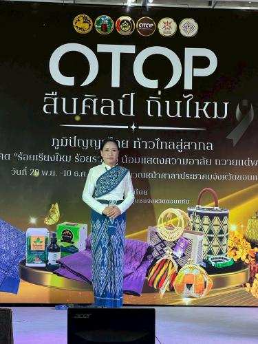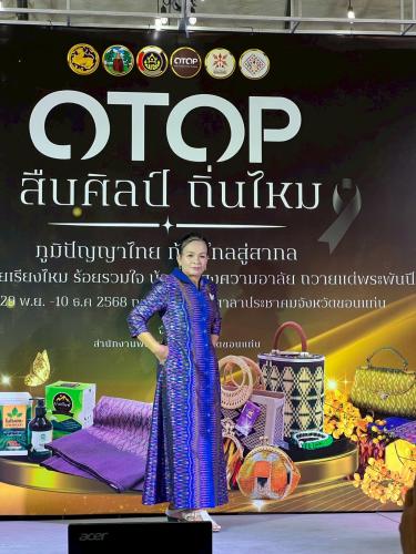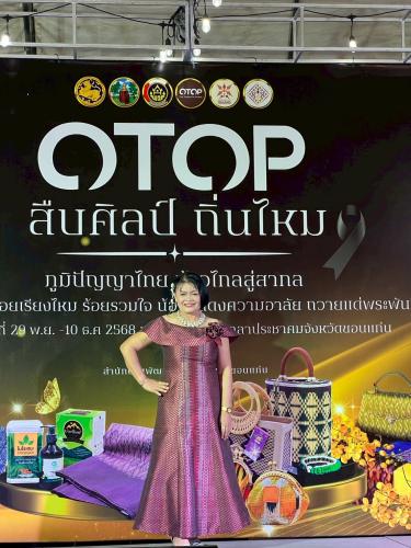 ณ งานจัดแสดงและจำหน่ายผลิตภัณฑ์ชุมชน OTOP ในการจัดงานเทศกาลไหมนานาชาติ ประเพณีผูกเสี่ยว งานกาชาดจังหวัดขอนแก่น